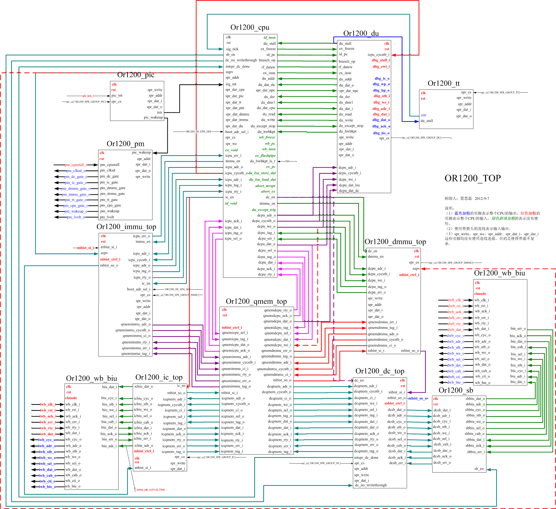 从OR1200_TOP角度看各子模块,wishbone总线分布如下图所示(图中加粗的紫色线条表示Wishbone总线规范,且均为点对点互连):